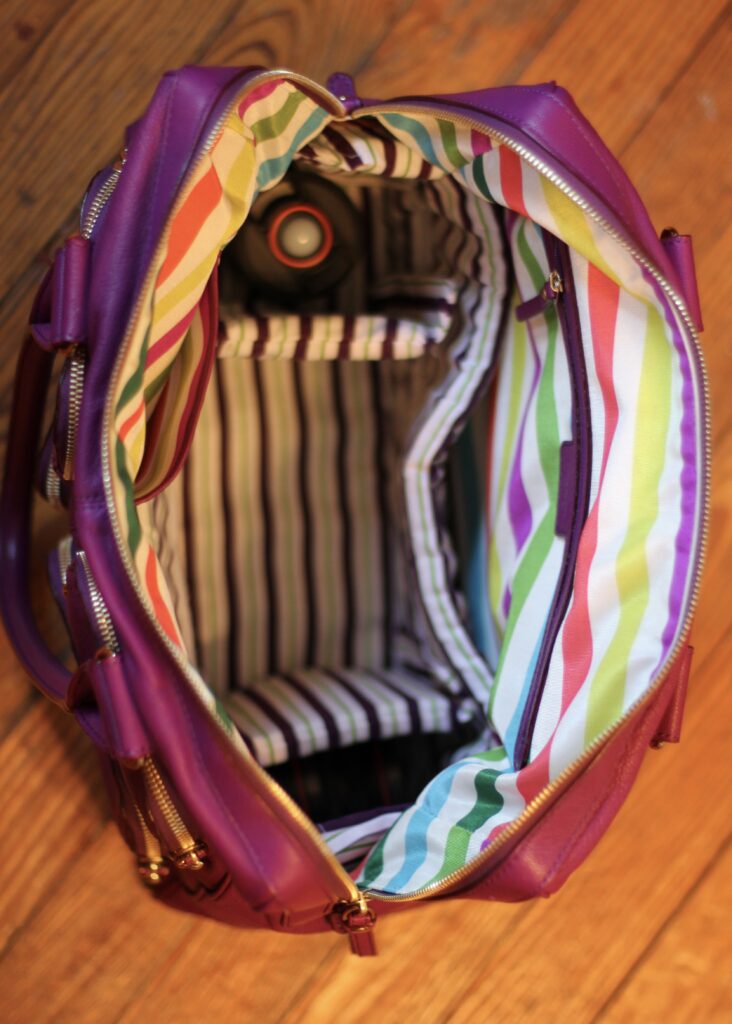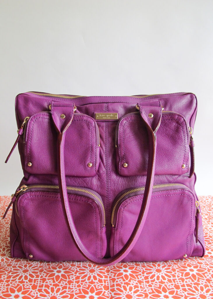 You know how you own a few items you just can’t imagine ever getting rid of? Even if it is no longer in style or a little worn, it still brings you joy? For me, this purple Kate Spade bag is one of those items. I received it as a gift almost 7 years ago and I have no plans to ever get rid of it- which is not like my normal konmari self. I love the bright color, smooth leather, colorful striped liner, and roomy interior. The four pockets on the outside are also great for keys, chapstick, gum, and my phone. A while back I saw a tutorial similar to this one for turning any bag into a camera bag. Since I often have my camera and computer with me, I loved the idea of being able to safely carry my camera with me in any bag I own, swapping it out when needed.