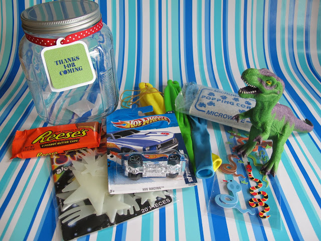 Boys Party Favor: For this boys party, we found glass jars at a thrift store and added Colin’s favorite things; reeses pieces, glow in the dark stars, hot wheels, punch balloons, popcorn, a dinosaur, stickers and a tag that read, “Thanks for coming…hope you enjoy a few of my favorite things!”
