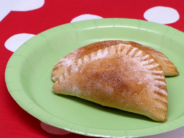 Peel and grate apples and place in a bowl. In a small bowl combine sugar and cinnamon. Then stir 3/4 of the sugar mix in with the apples. Roll each biscuit to a 5 inch circle with a rolling pin. Be sure to flour the biscuit or the rolling pin a little bit so that they don’t stick to each other. (Kid’s love to do this part!)