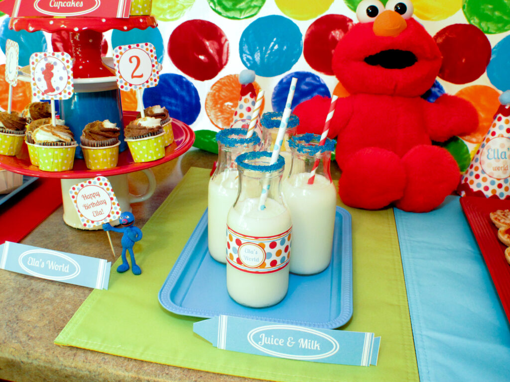 For this Elmo’s World party, we kept the menu easy and kid-approved with pizza bagels, carrots and dip, watermelon slices, goldfish crackers, cupcakes, and milk. Everything was quick to put together, colorful, and perfect for little hands. The mix of savory snacks, fresh fruit, and a sweet treat kept things balanced without feeling overdone.