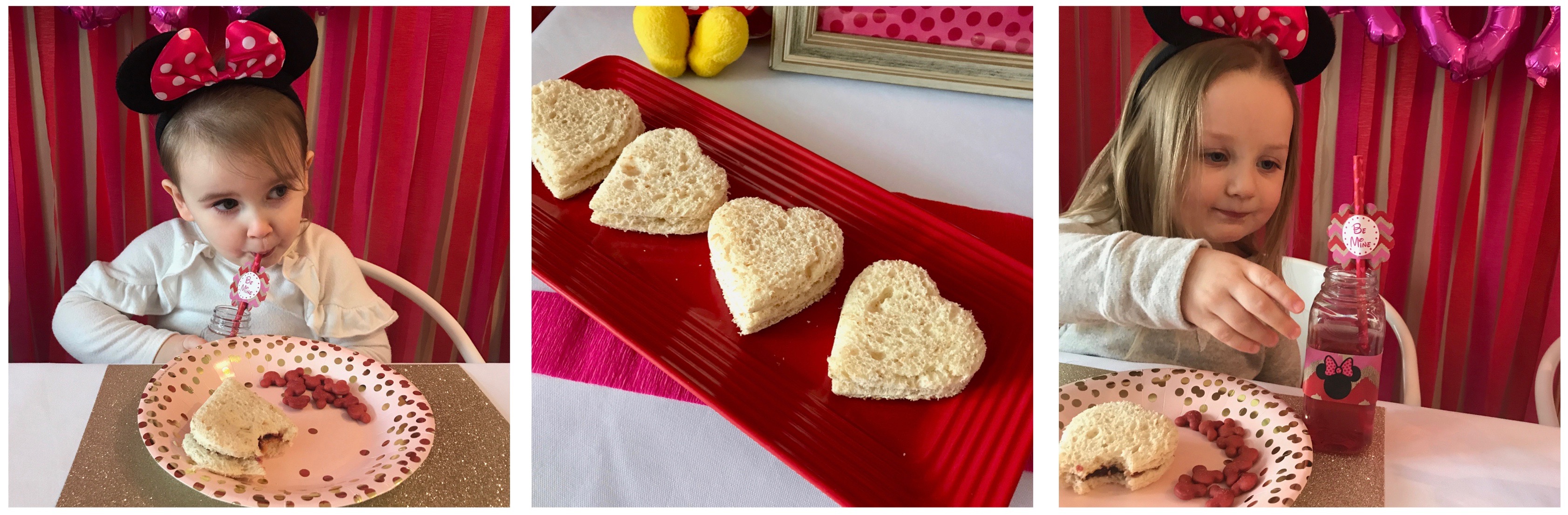 Lunch was super simple with sandwiches cut out like hearts and pink goldfish. I also put juice into cute little plastic cups with Minnie Mouse labels and a red straw. I thought for sure at least one of them would spill but they were so excited about it they were extra careful. After lunch we played a stacking game with candy hearts. Neither of them realized that they were candy, so they were content to try and stack as many of the little pastel hearts as they could before tipping over.