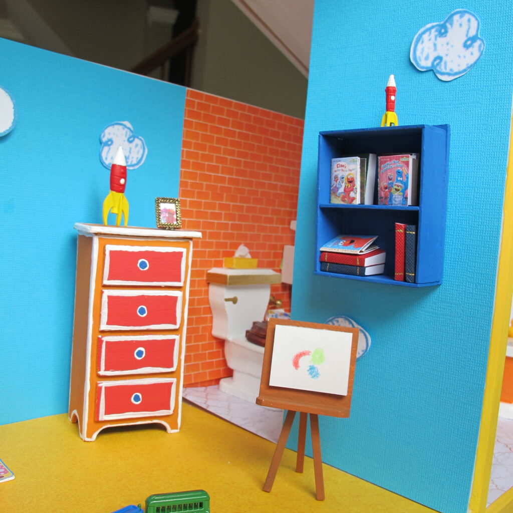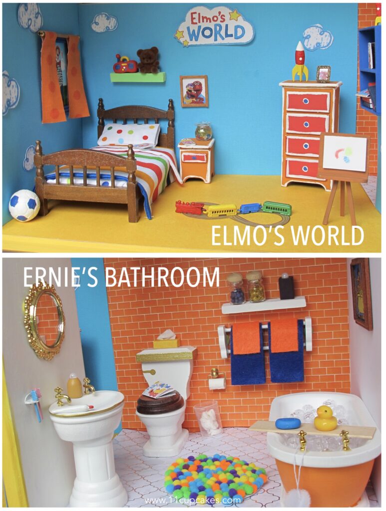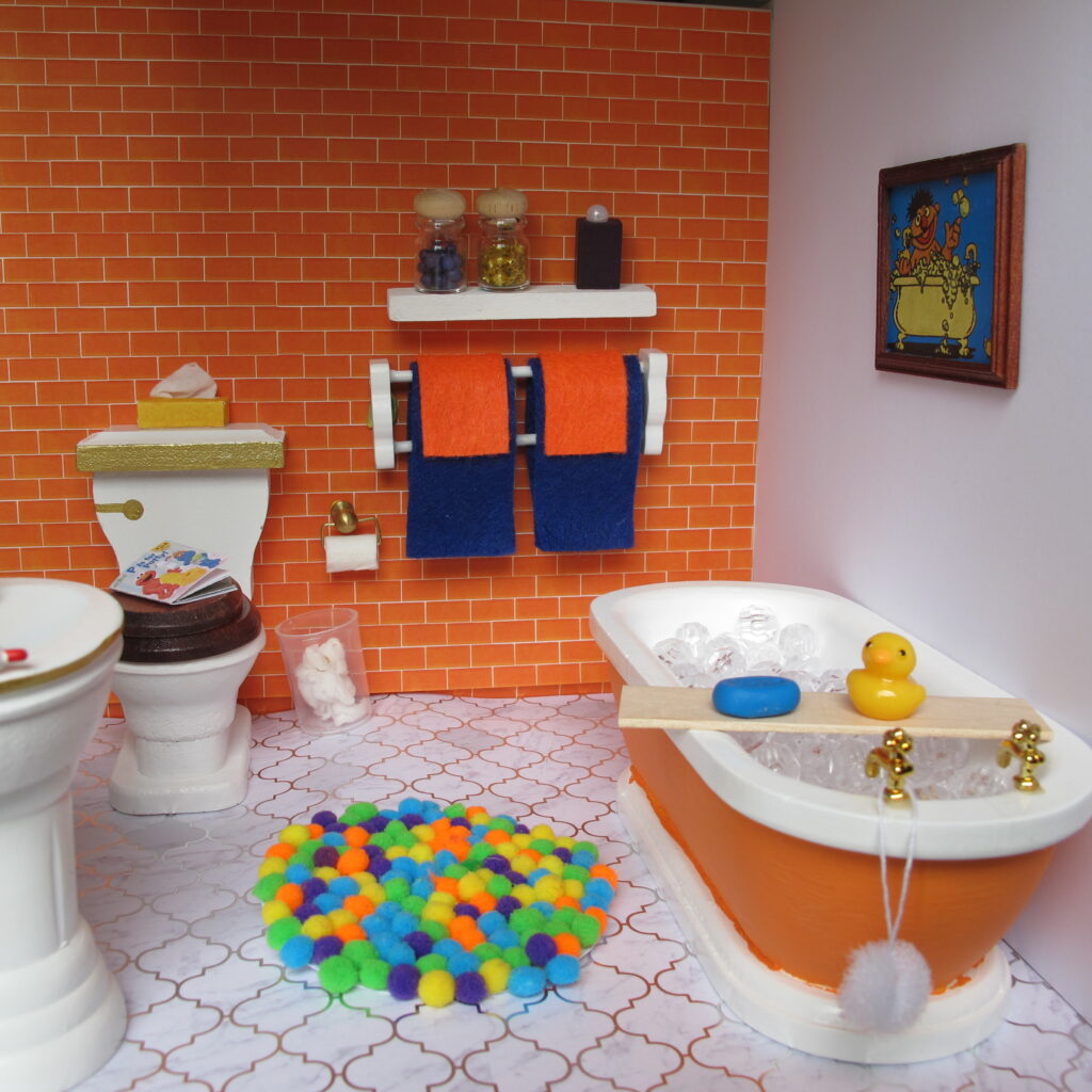 Next up- Ernie’s Bathroom! I thought it would be fun to make this room orange, so I designed an orange brick pattern and printed it for the back wall. The bathroom floor is also scrapbook paper. I bought this bathroom set from Melissa & Doug and painted the bathtub orange.