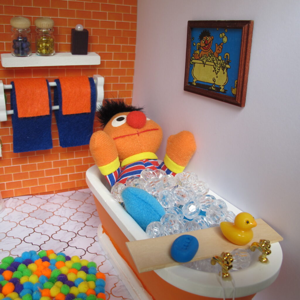 Ernie’s bathtub is my favorite part of this room. The bubbles are plastic beads and the blue soap is made from clay. I made the little rug using tiny pom poms glued to some cardboard.