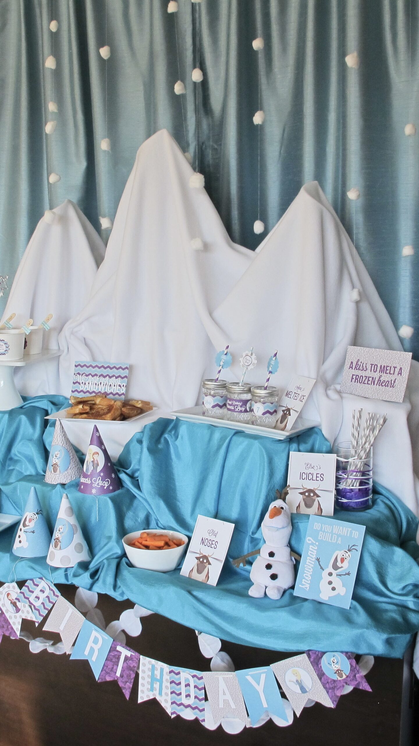 This Winter Wonderland Frozen party was created right on the center island in my kitchen. This prove that you don’t need a huge space to make