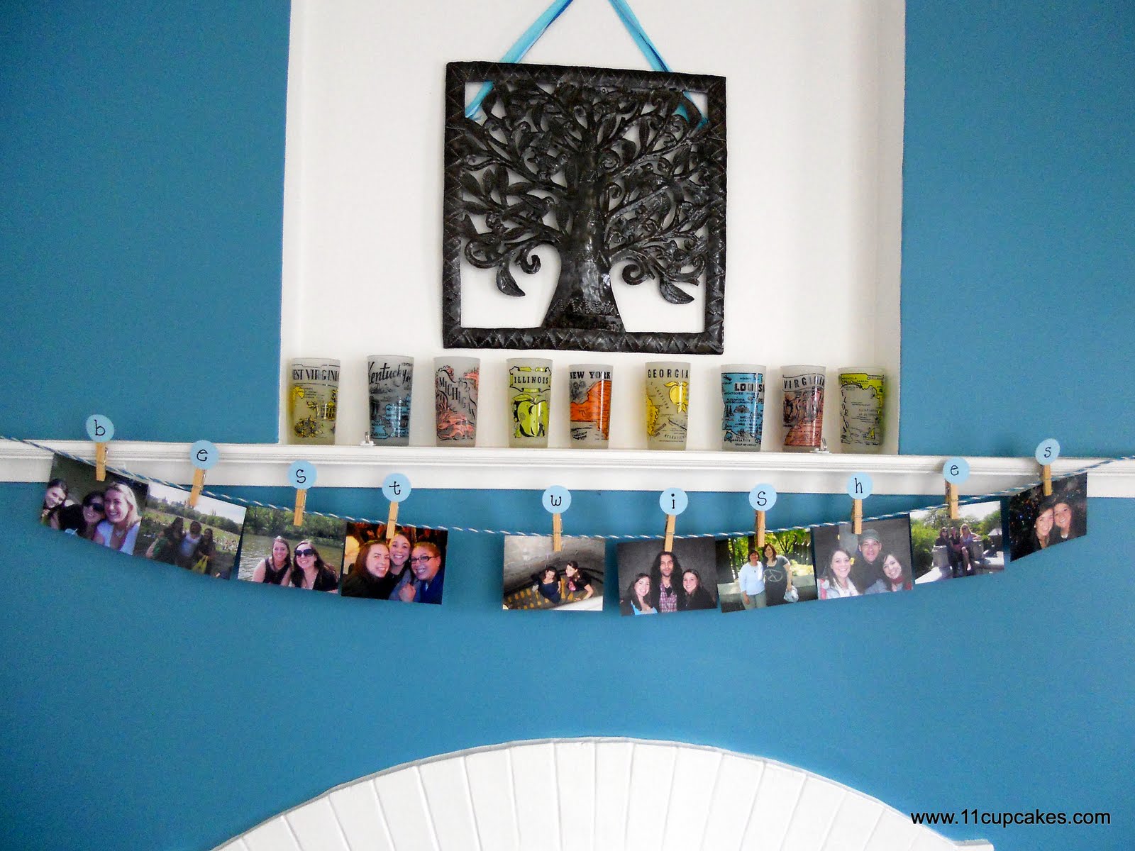 Our second banner idea was created using dollar store clothes line, clothespins, photos, scrapbook paper. Choosing 10 photographs was the hard part, everything else was simple.  We cut out 10-1 1/2 inch circles from scrapbook paper and then wrote out best wishes with one letter on each.  Using glue we attached our letters to the clothespins, hung up our pictures, and the banner was done!