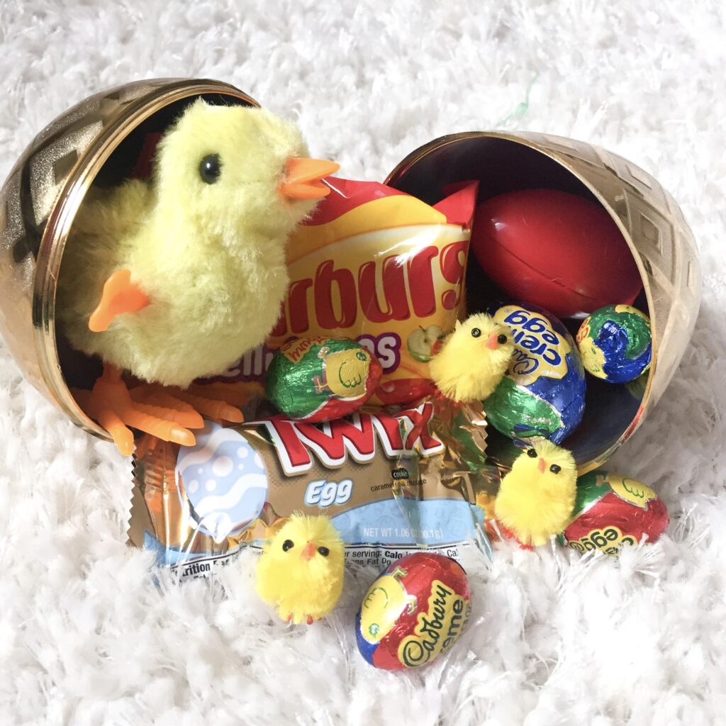 My brother wouldn’t open his easter egg mail because he thought it was a prank. I’m not sure what he thought would be inside, but was pleasantly  surprised when he found only candy and tiny toy chicks. You can also play a delightful game of Easter Chickers with those little toy chicks :)