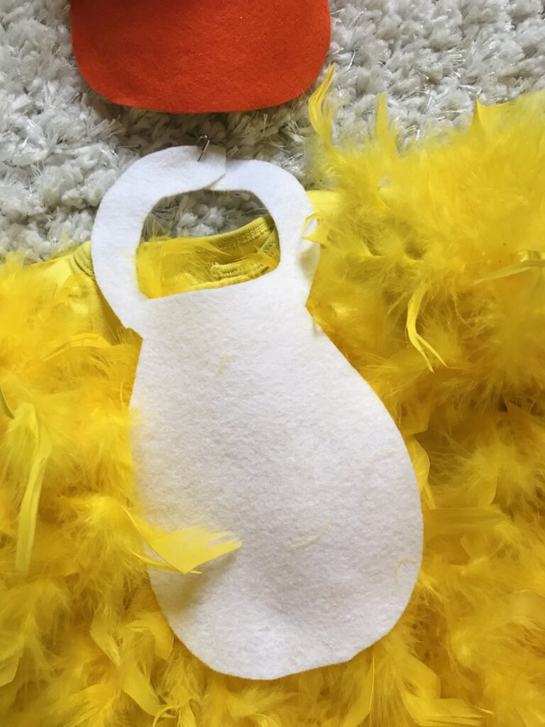 I ordered a yellow hat on amazon and added eyes and some orange felt for the beak. She loves the hat and still wears it when we go to the playground. The white bib was a last minute addition when the feathers were tickling her face. I cut out some white felt and pinned it together, making it more comfortable for her to wear. The knitted orange feet were part of a baby duck costume I purchased from Amazon. I took a risk that they would stretch and they fit perfectly.