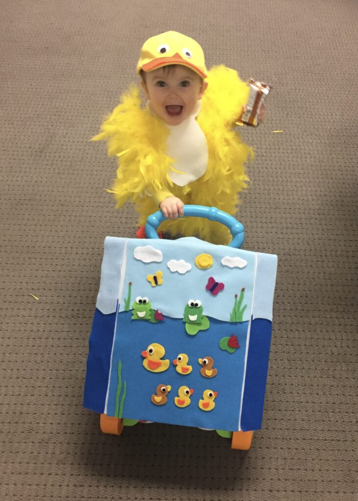 My favorite part of the costume was her little duck pond. She was just starting to walk so we had had gotten her a walker to use around the house. I wanted her to be able to use it to trick-or-treat instead of carrying her the entire time, so had planned to bring it with us. The night before I got the idea to make it look like a little duck pond using a white poster board and felt. Luckily I glued everything on since there were many little curious hands at daycare.