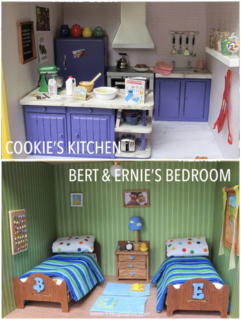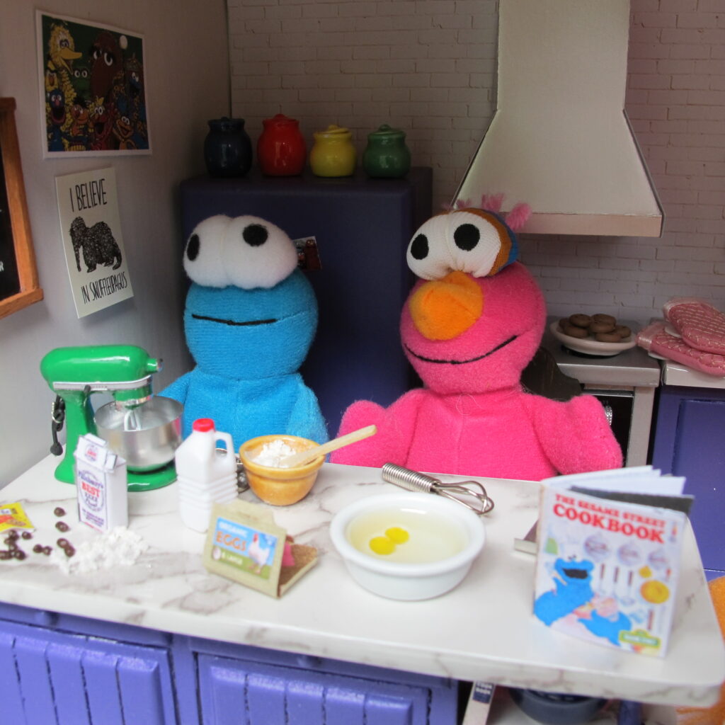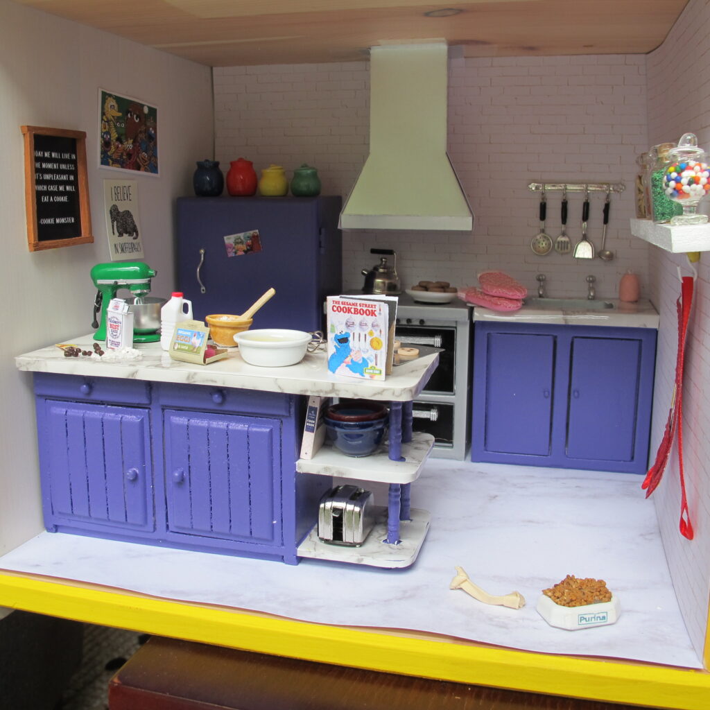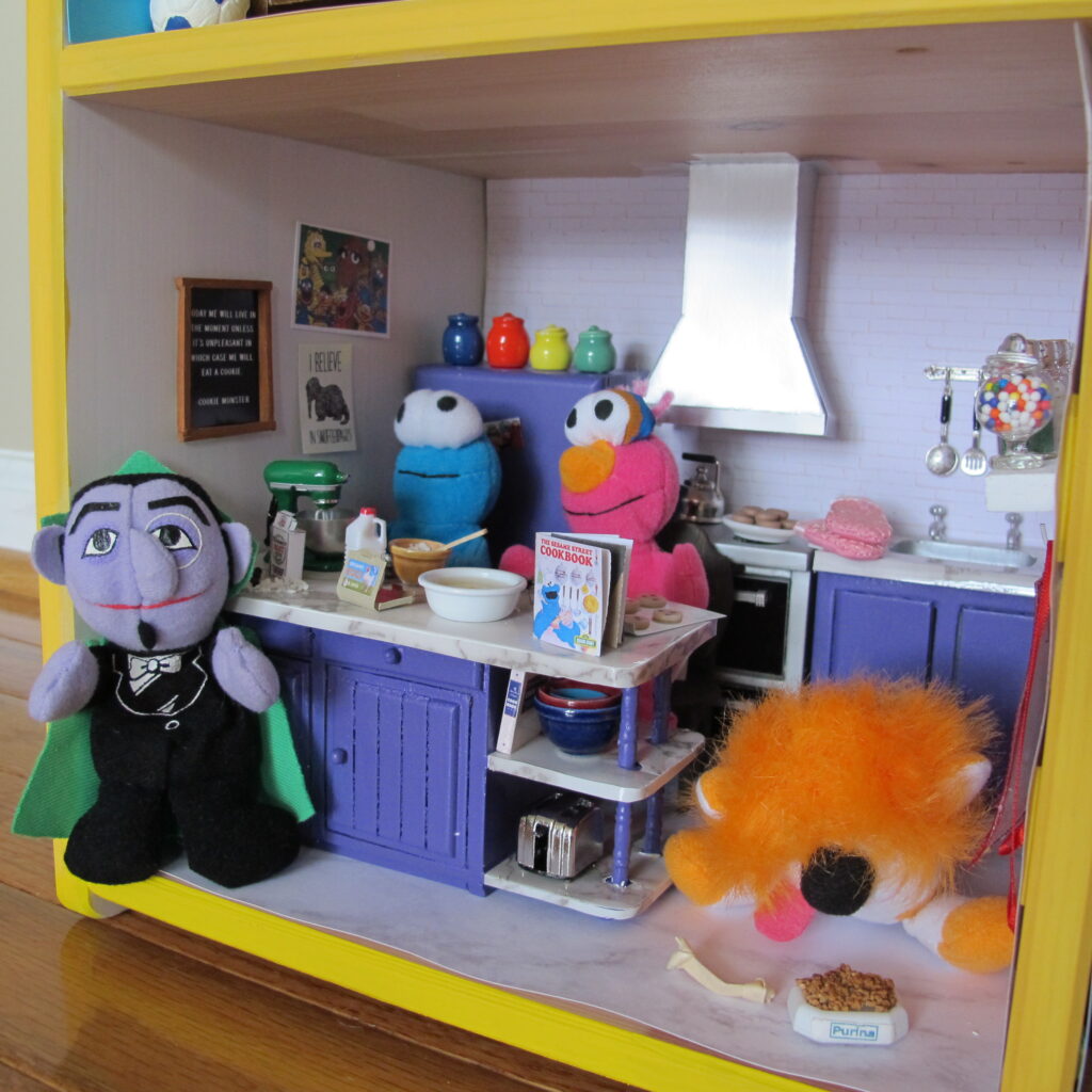 COOKIE MONSTER’S KITCHEN- The dollhouse needed a kitchen, and what better person to hang out in there than Cookie Monster, baking lots of cookies. Telly and The Count came to help, and Barkley is hanging out hoping for a few cookies to fall on the floor.
