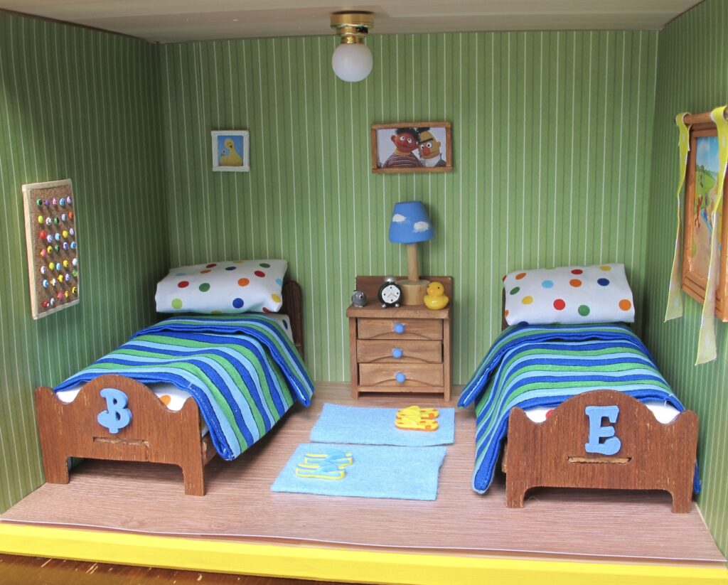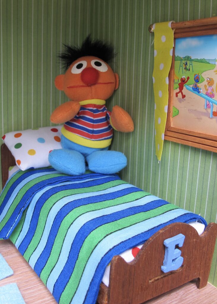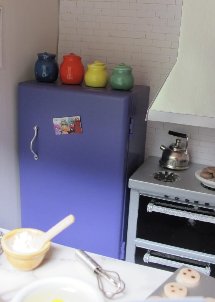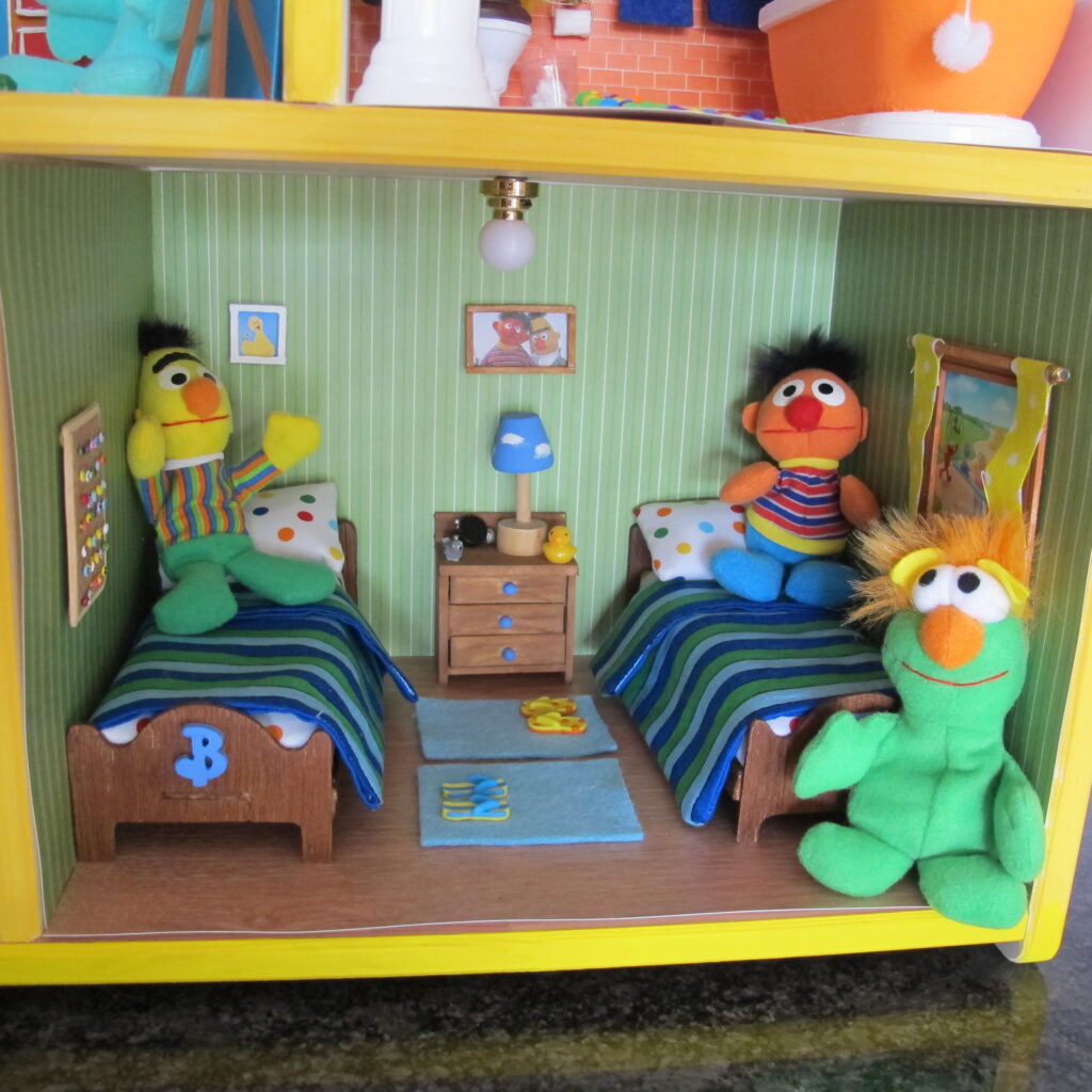 COOKIE MONSTER’S KITCHEN- The dollhouse needed a kitchen, and what better person to hang out in there than Cookie Monster, baking lots of cookies. Telly and The Count came to help, and Barkley is hanging out hoping for a few cookies to fall on the floor.