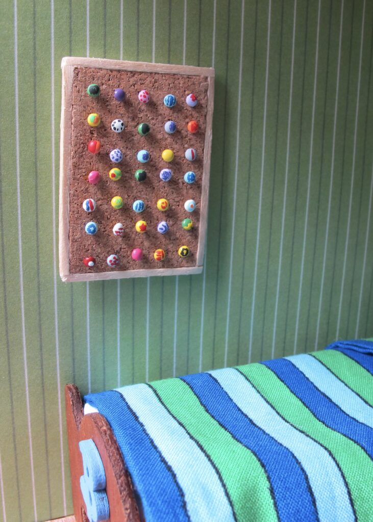 My favorite detail in the house is Bert’s bottle cap collection, which was made using tiny colored brads that I painted and glued onto cork.