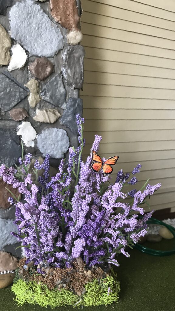 When building the chimney, my grandpa had a butterfly hidden in the rock formation in celebration of my Grandmother’s love of butterflies. I did the same when constructing the matching chimney using cardboard and egg cartons. Can you find them both?