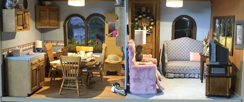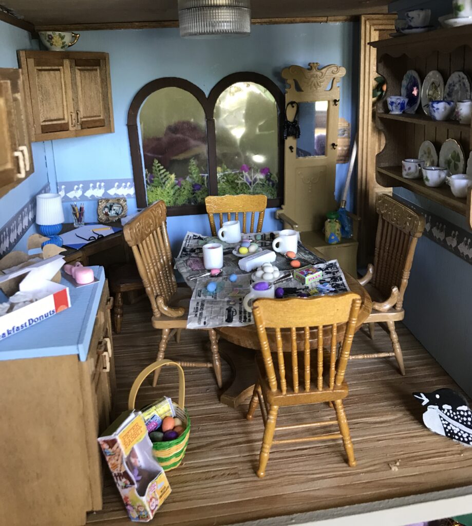 The kitchen features blue walls with a country goose border, a wooden corner cabinet and desk, tiny bifocals, and a hall rack. To create the Easter festivities, I shrunk a 1994 page from the Brainerd Dispatch newspaper and rolled eggs from clay. Easter weekend was filled with dying eggs, easter egg hunts in the yard, and searching for the giant chocolate bunny the Easter bunny left on Sunday morning.