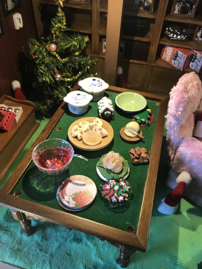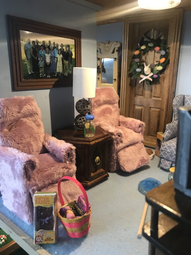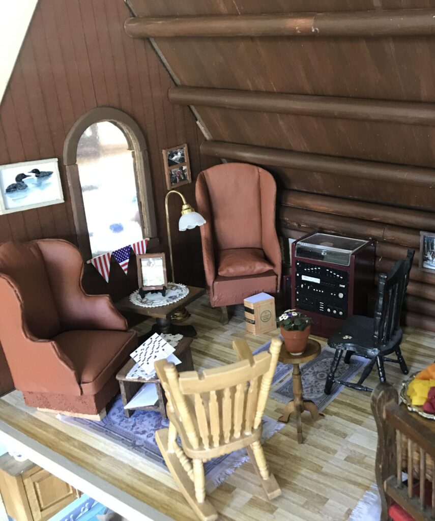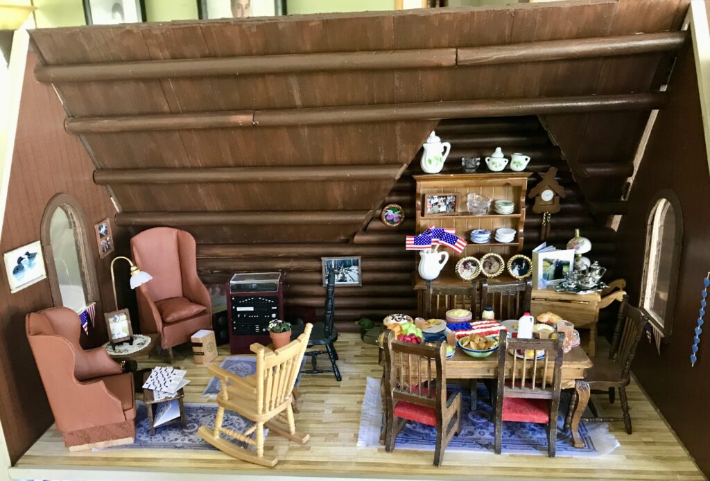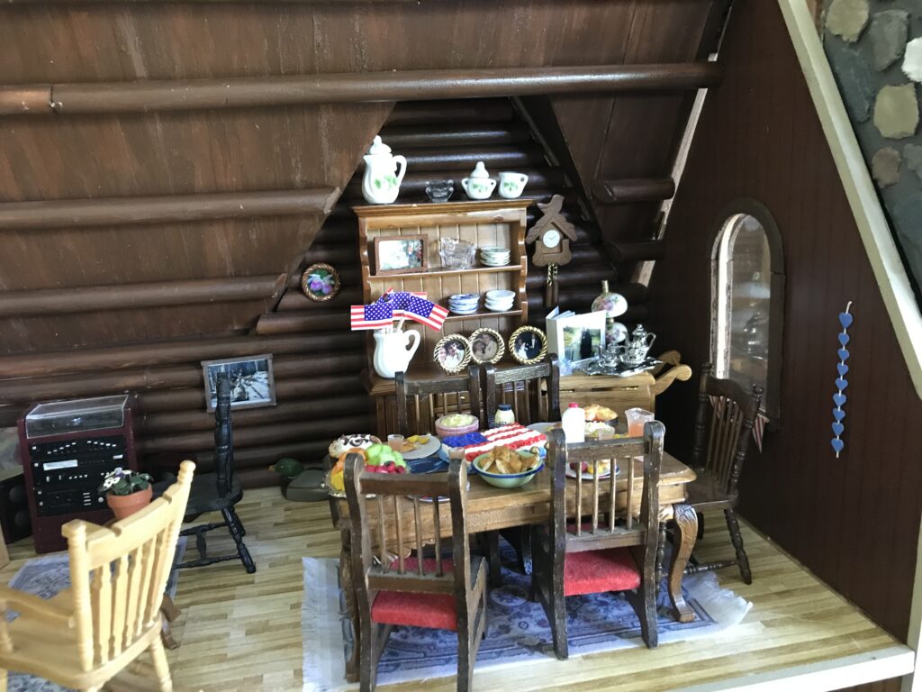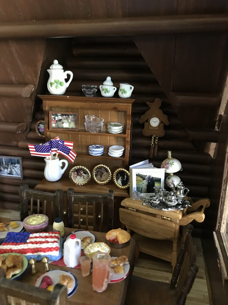 In the living room, you’ll find the matching crushed velvet chairs where my Grandpa always sits to do crossword puzzles and a picture of Peggi – their sweet springer spaniel who was by our side on every picnic, nature walk, and pontoon ride. The area rugs are replicas of the ones adorning their hardwood floors, which I made by taking pictures of the actual rugs, shrinking them down on my computer, and printing them on fabric paper. A miniature tea cart sits in the corner, adorned with a metal tea set, vintage lamp, and family scrapbook that fits in the palm of your hand.