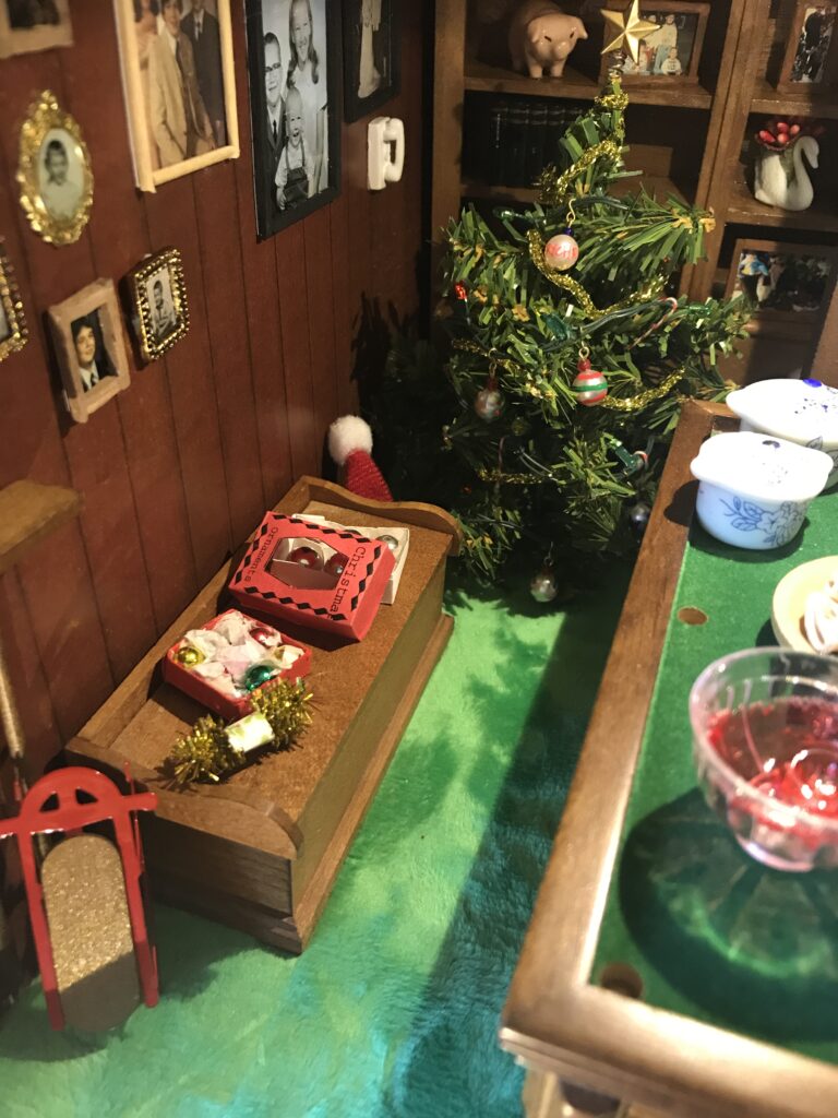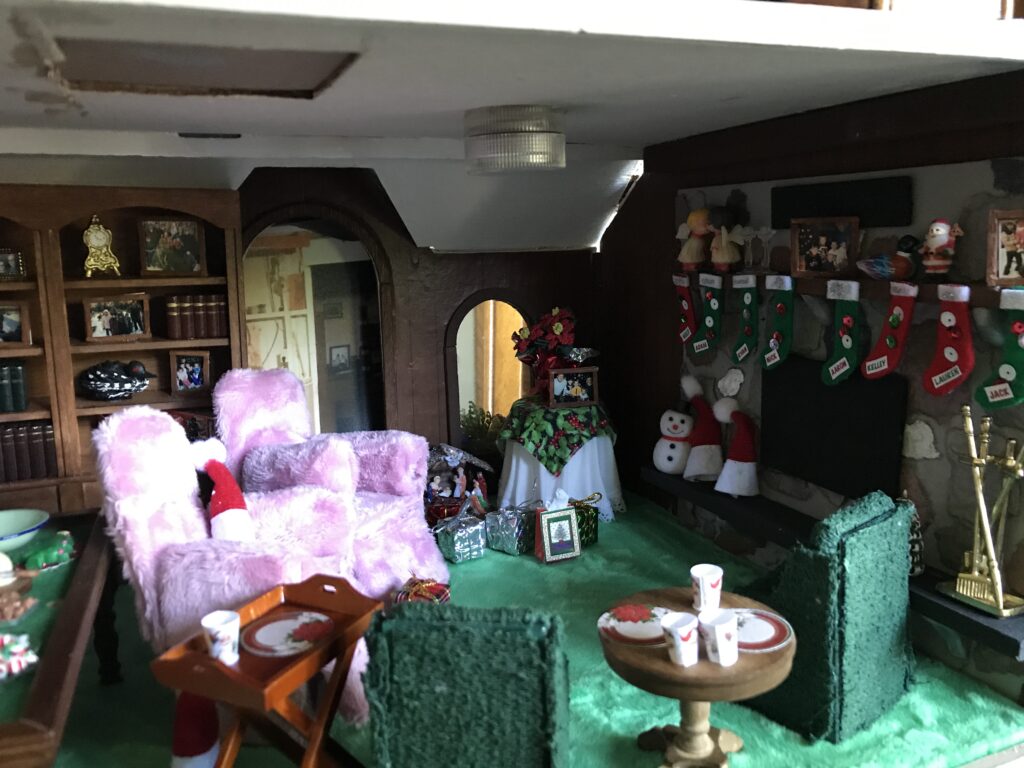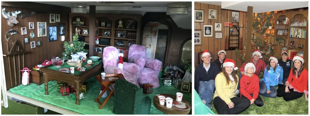 Head downstairs, and it’s Christmas. The basement features my grandparent’s bright green carpet, wood-paneled walls, tiny family photos, a built-in bookcase, and a pool table. Look around, and you can see the Christmas tree being decorated with tiny ornaments and tinsel and wrapped presents waiting to be opened. Each of our homemade stockings hung from the fireplace.