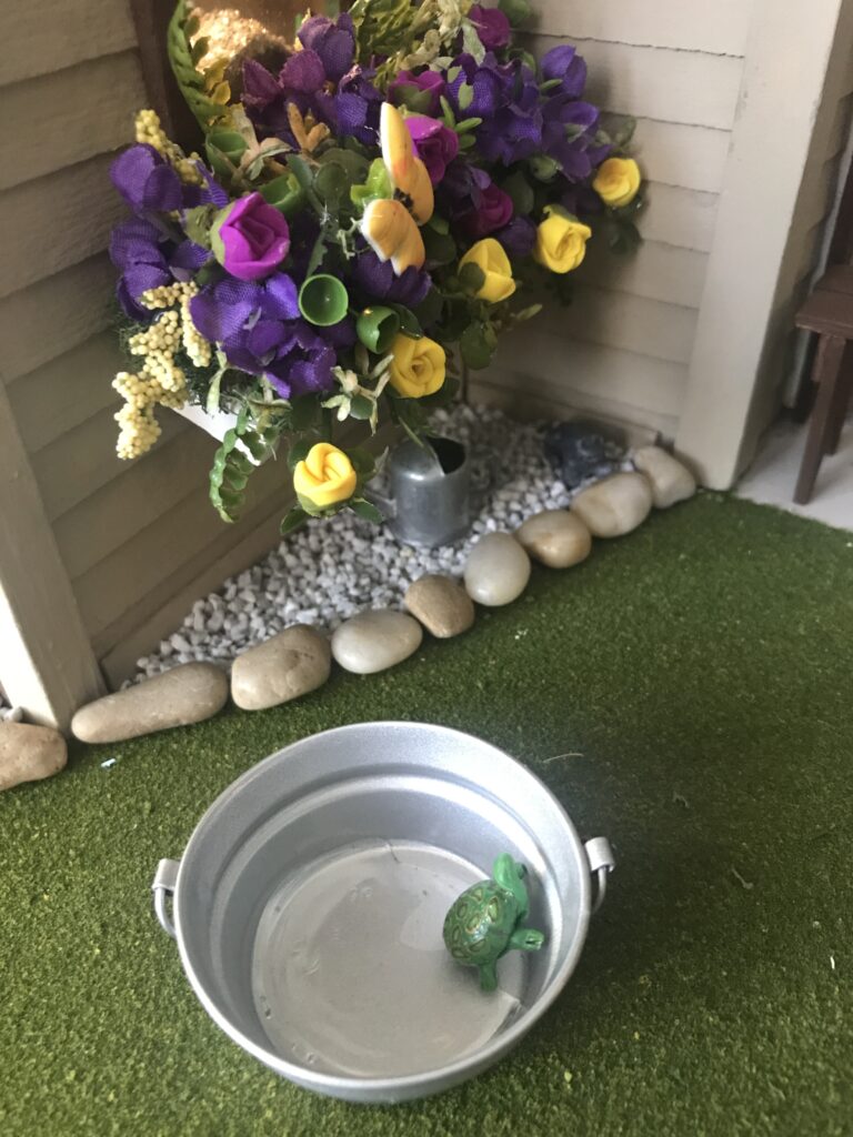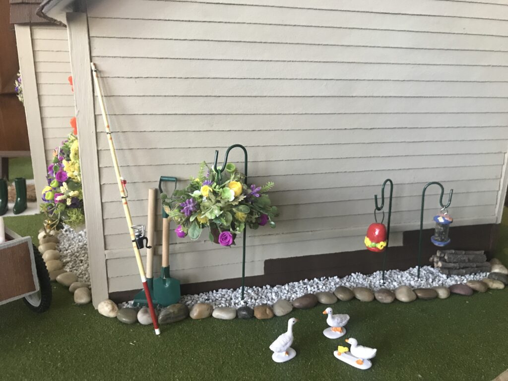 Finally, step into the yard to find stone landscaping, a brown bench and green galoshes, a pink rose bush, and plenty of beautiful flowers and butterflies.