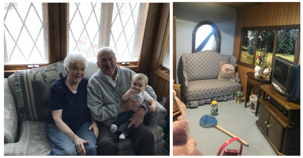 Grandma and Grandpa sitting in the blue loveseat in the sunroom. The (tiny) windows show a photo of the actual yard, and bug jars and butterfly nets were often laying around after my cousins went searching for bugs and worms.