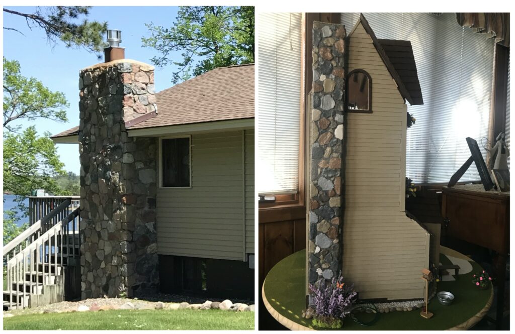 When building the chimney, my grandpa had a butterfly hidden in the rock formation in celebration of my Grandmother’s love of butterflies. I did the same when constructing the matching chimney using cardboard and egg cartons. Can you find them both?