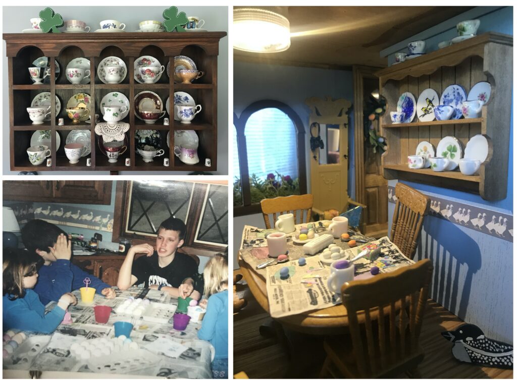 The kitchen features blue walls with a country goose border, a wooden corner cabinet and desk, tiny bifocals, and a hall rack. To create the Easter festivities, I shrunk a 1994 page from the Brainerd Dispatch newspaper and rolled eggs from clay. Easter weekend was filled with dying eggs, easter egg hunts in the yard, and searching for the giant chocolate bunny the Easter bunny left on Sunday morning.