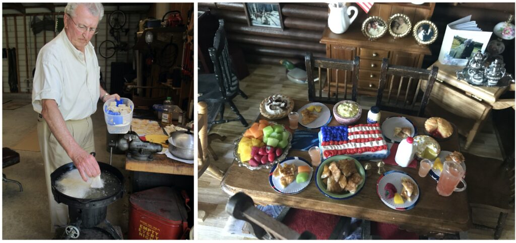 In the living room, you’ll find the matching crushed velvet chairs where my Grandpa always sits to do crossword puzzles and a picture of Peggi – their sweet springer spaniel who was by our side on every picnic, nature walk, and pontoon ride. The area rugs are replicas of the ones adorning their hardwood floors, which I made by taking pictures of the actual rugs, shrinking them down on my computer, and printing them on fabric paper. A miniature tea cart sits in the corner, adorned with a metal tea set, vintage lamp, and family scrapbook that fits in the palm of your hand.