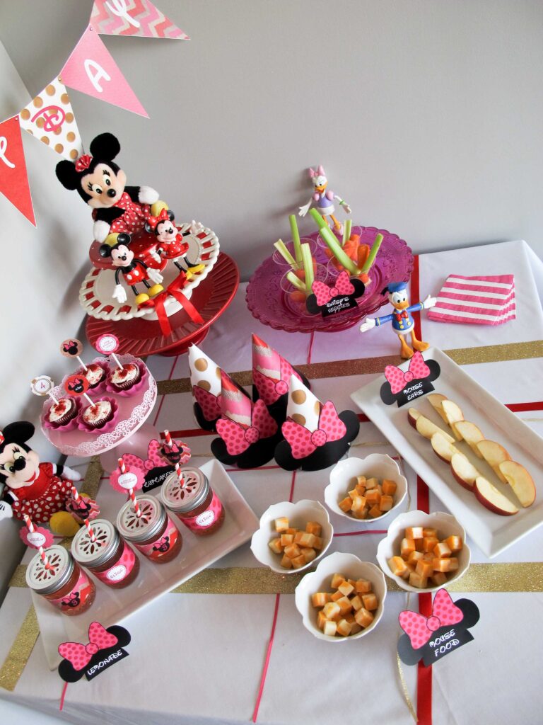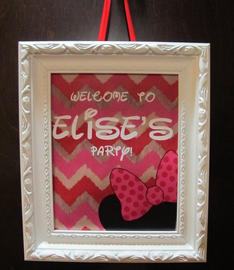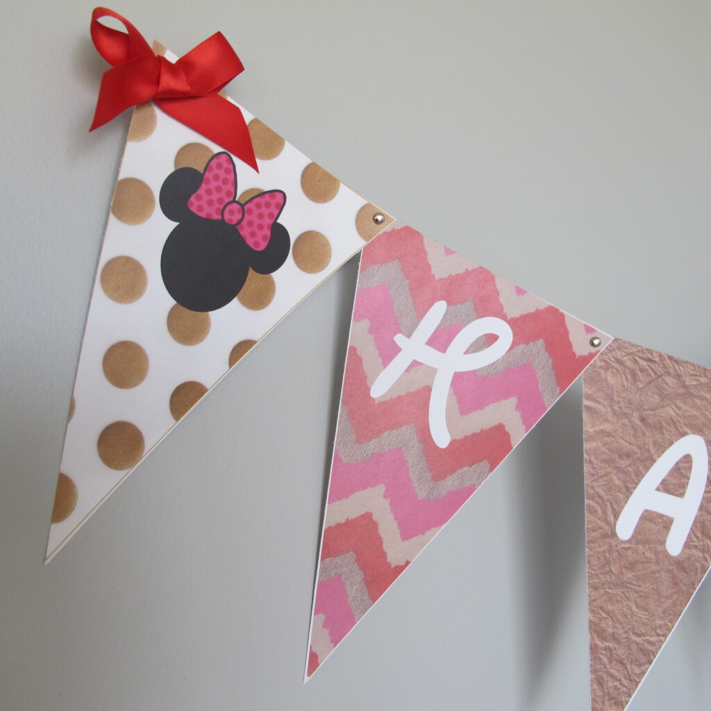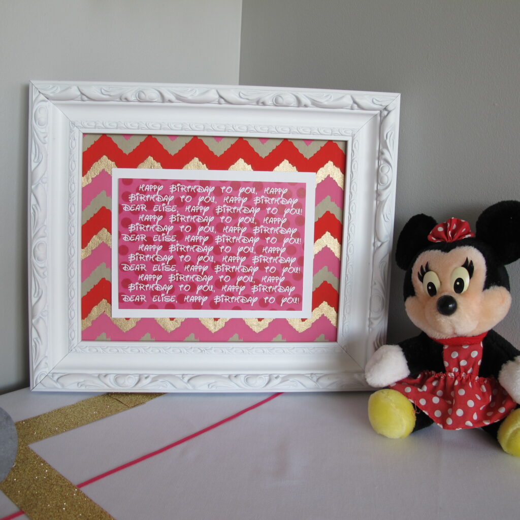 We kept this Minnie Mouse party simple yet fun and colorful. Welcome your party guests with a fun door sign, and hang up a colorful pink and gold Happy Birthday banner. Guests will love these fun Minnie Mouse party hats. We used a simple white tablecloth with pink, red, and gold ribbon on the table. Parties don’t have to be extravagant, just fun!