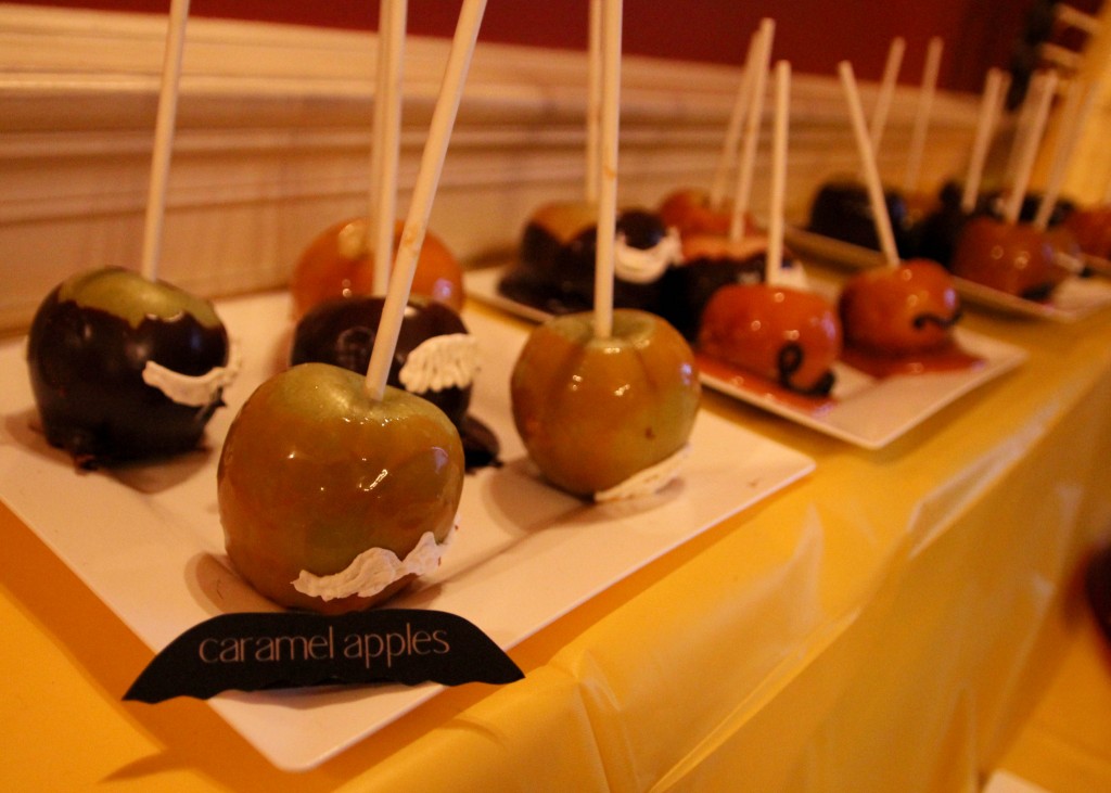 We served caramel apples (with mustaches), chocolate stache lollipops made from a candy mold, and a chocolate fountain. Fixings included marshmallows, pretzels, bananas, and vanilla wafers.