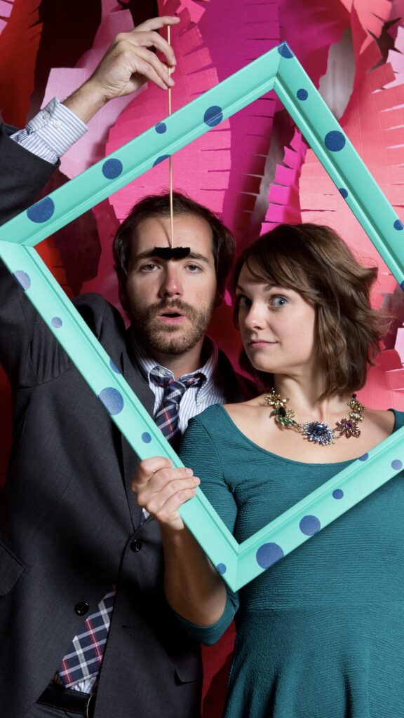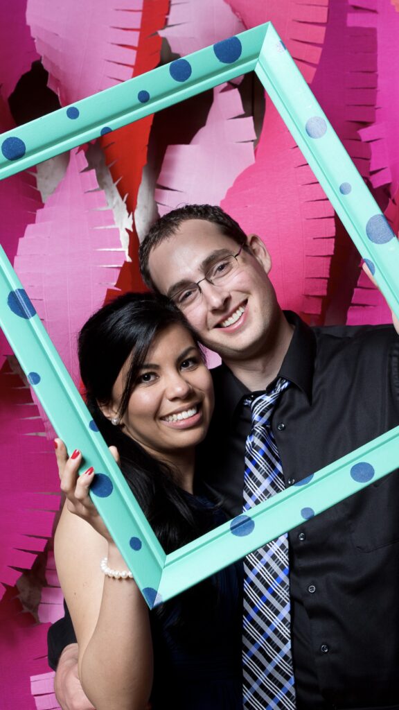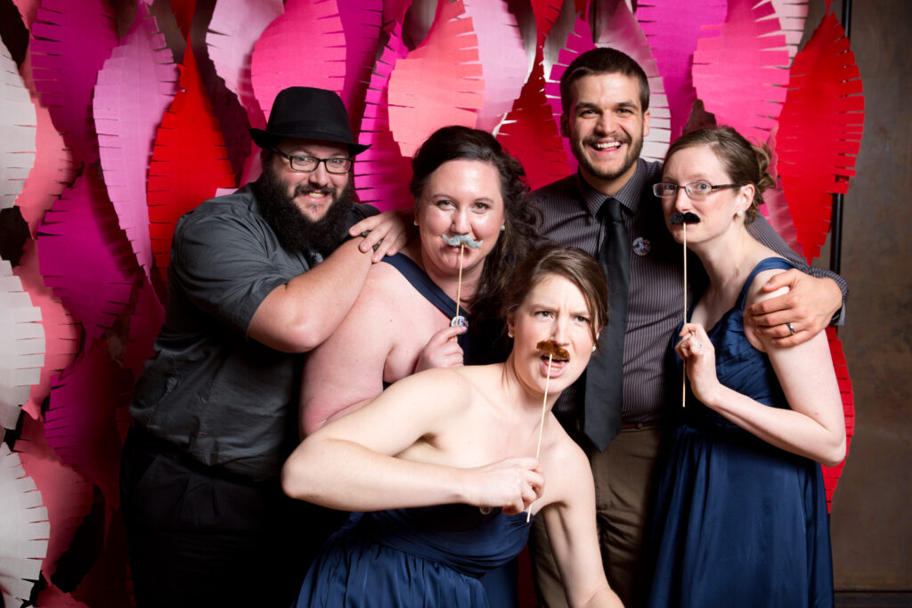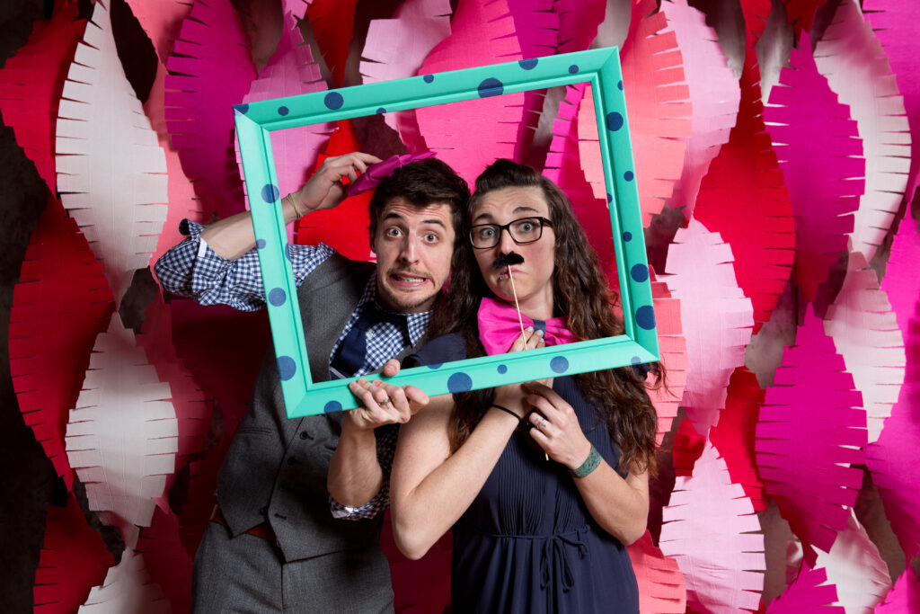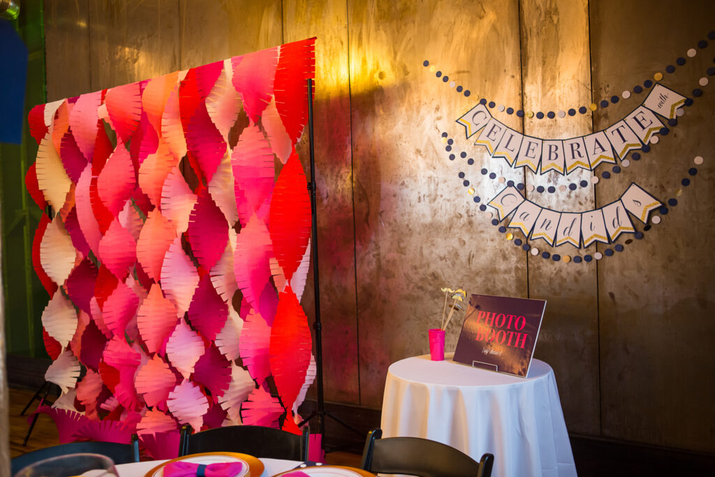 I ordered large rolls of tissue paper and created a fun photo-booth backdrop using this tutorial. We had the paper pre-cut, and then taped it to the top of a photo back-drop frame.