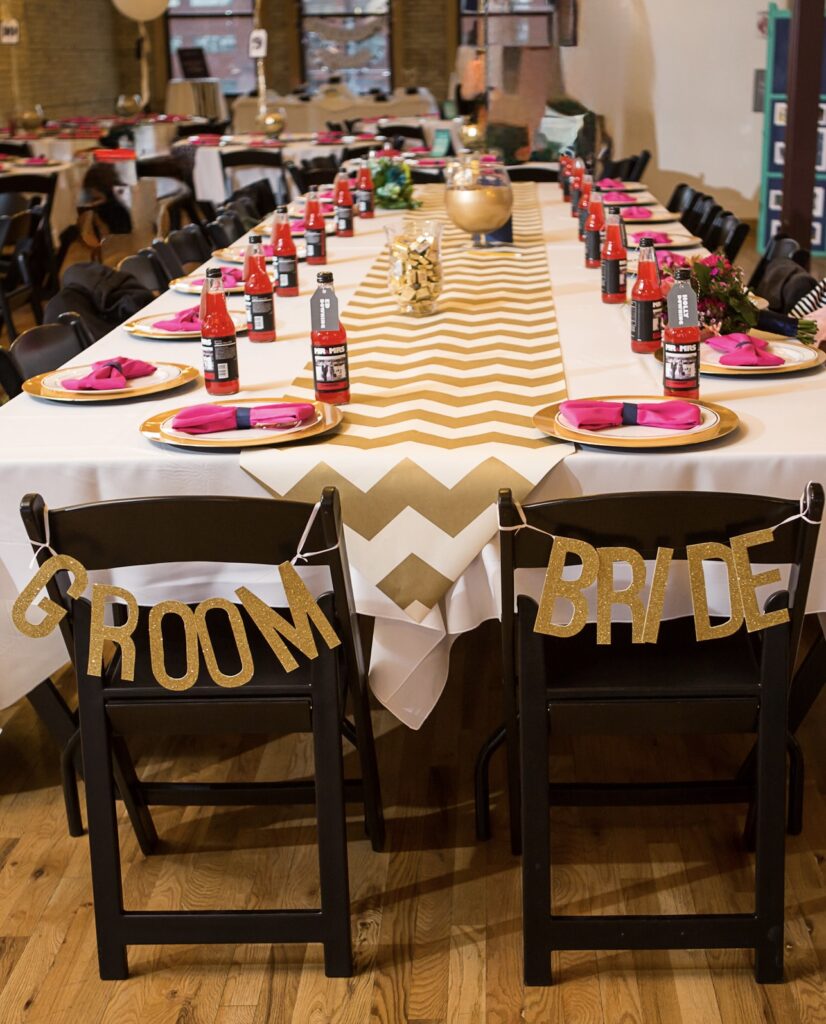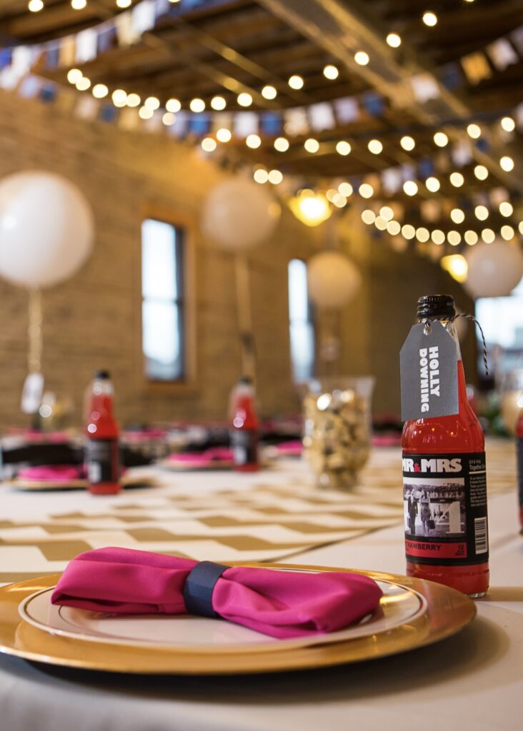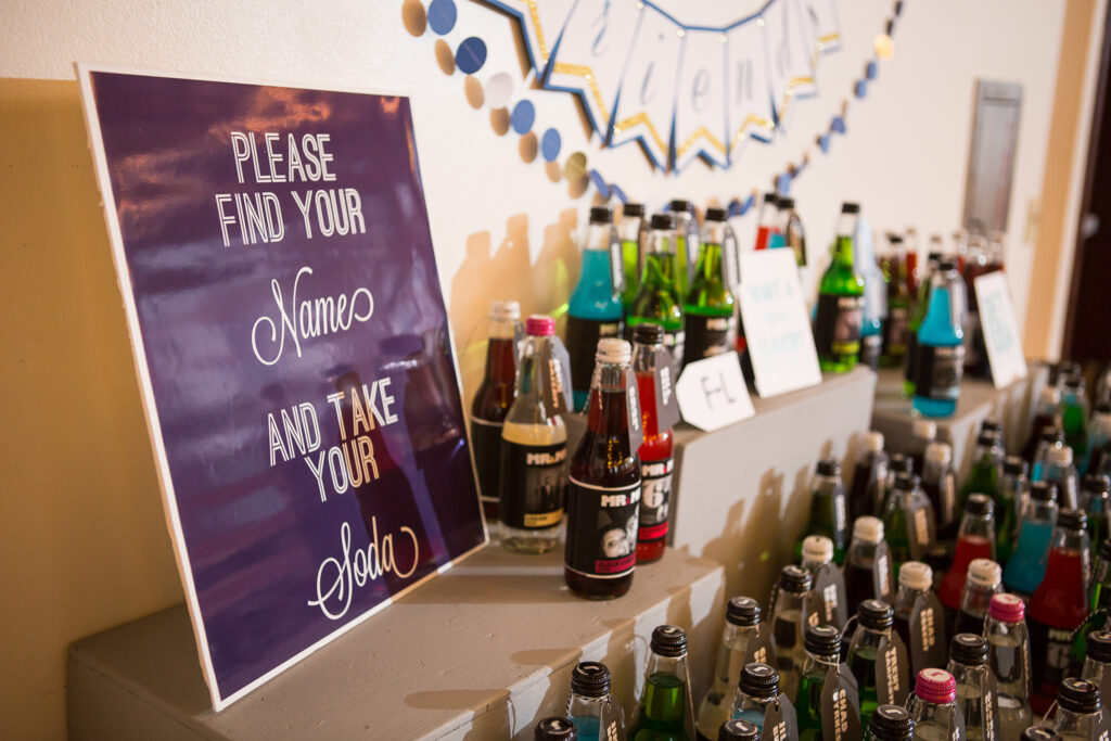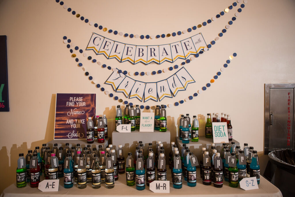 I designed a custom Jones Soda Label for each table, with photos of us and the table number printed on the bottles. Guests had to find their name, and then find their table according to the number on their soda. It was a fun project, and served as a practical ‘favor’ that guests could drink or take home.