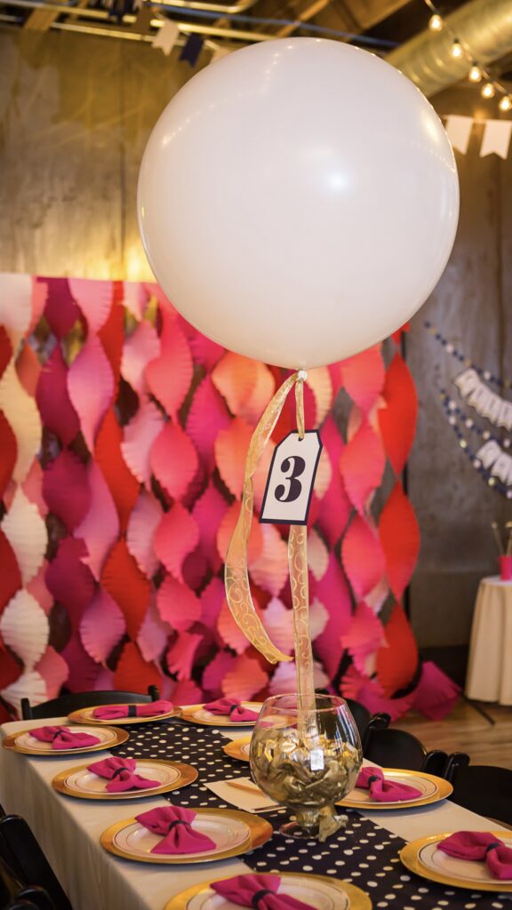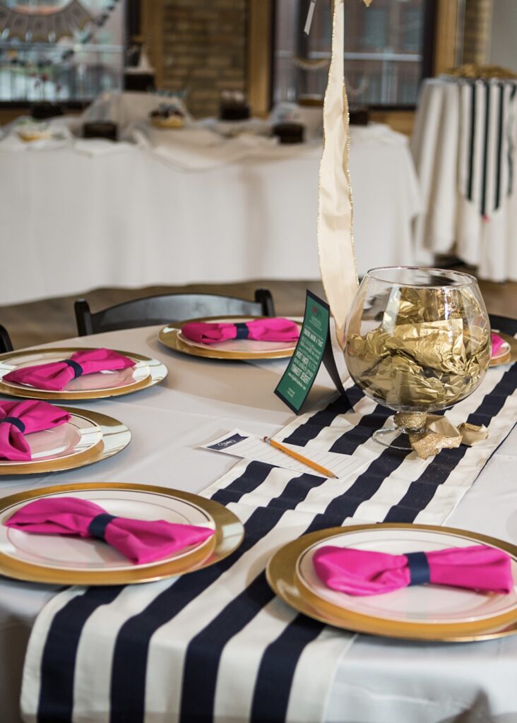 My favorite thing about the reception was the giant white balloons that served as table numbers. Each table had a navy and white runner, gold chargers, white plates, and pink napkins folded into bows. The balloons were tied around glass vases filled with gold wrapped chocolates.