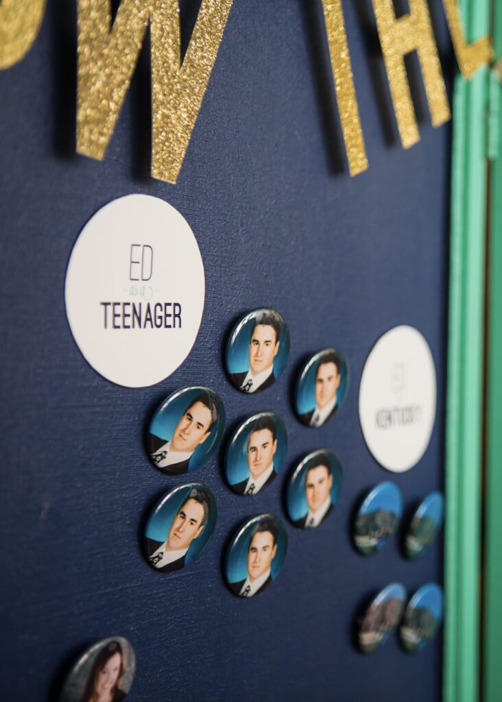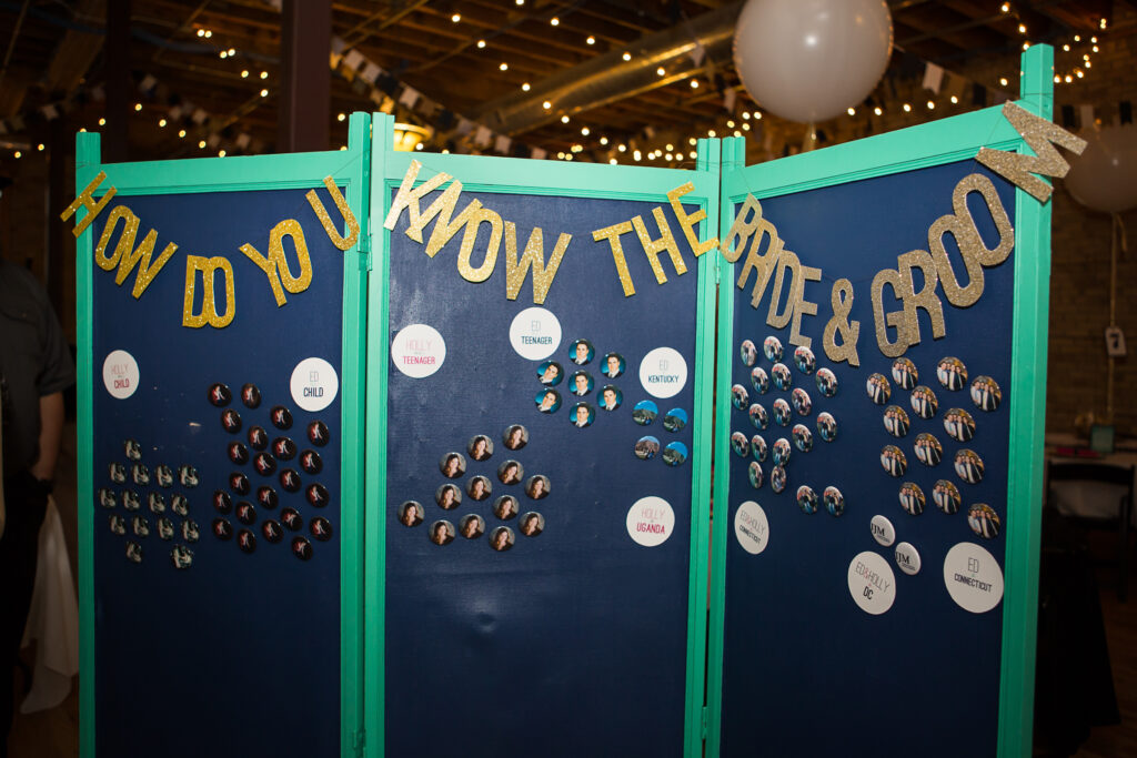 When guests first arrived, they were sent to cocktail hour, where drinks and horderves were being served. A friend had painted a room divider, and I had buttons made with photos from different stages of our lives. Guests were asked to take the button that represented how they knew us. I wasn’t sure people would be up for this, so it was a lot of fun to walk into the reception later and see everyone wearing their buttons.