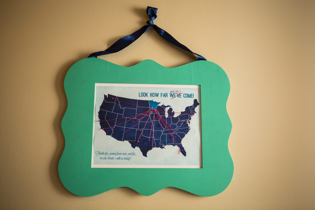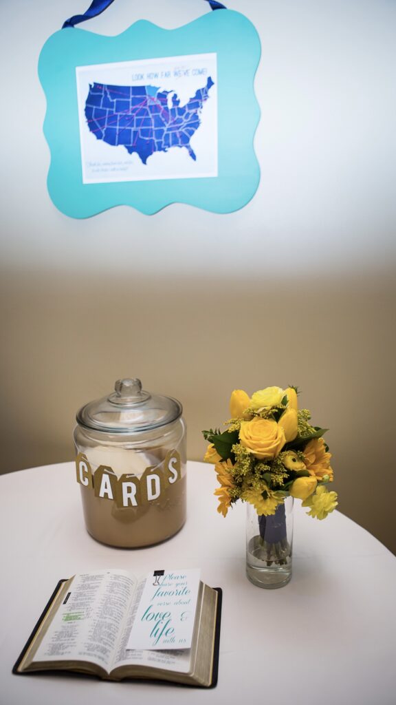 I used a large cookie jar that I painted part gold as the card box, and we asked people to highlight their favorite bible verse in the ‘guest book.’ Since about half of our guests were traveling from out of state, I created a map that showed the states that everyone came from.