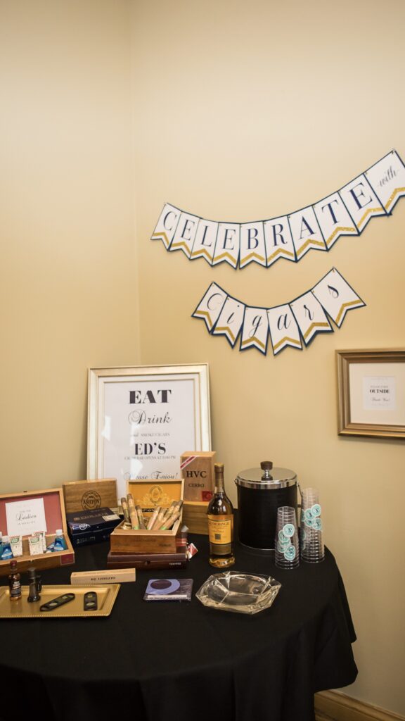 I surprised my husband with a cigar bar at the reception, complete with cigars, bourbon, and lots of old cigar boxes. My favorite detail was the ‘For the Ladies in Your Life’ box that had mints, gum, and febreeze.